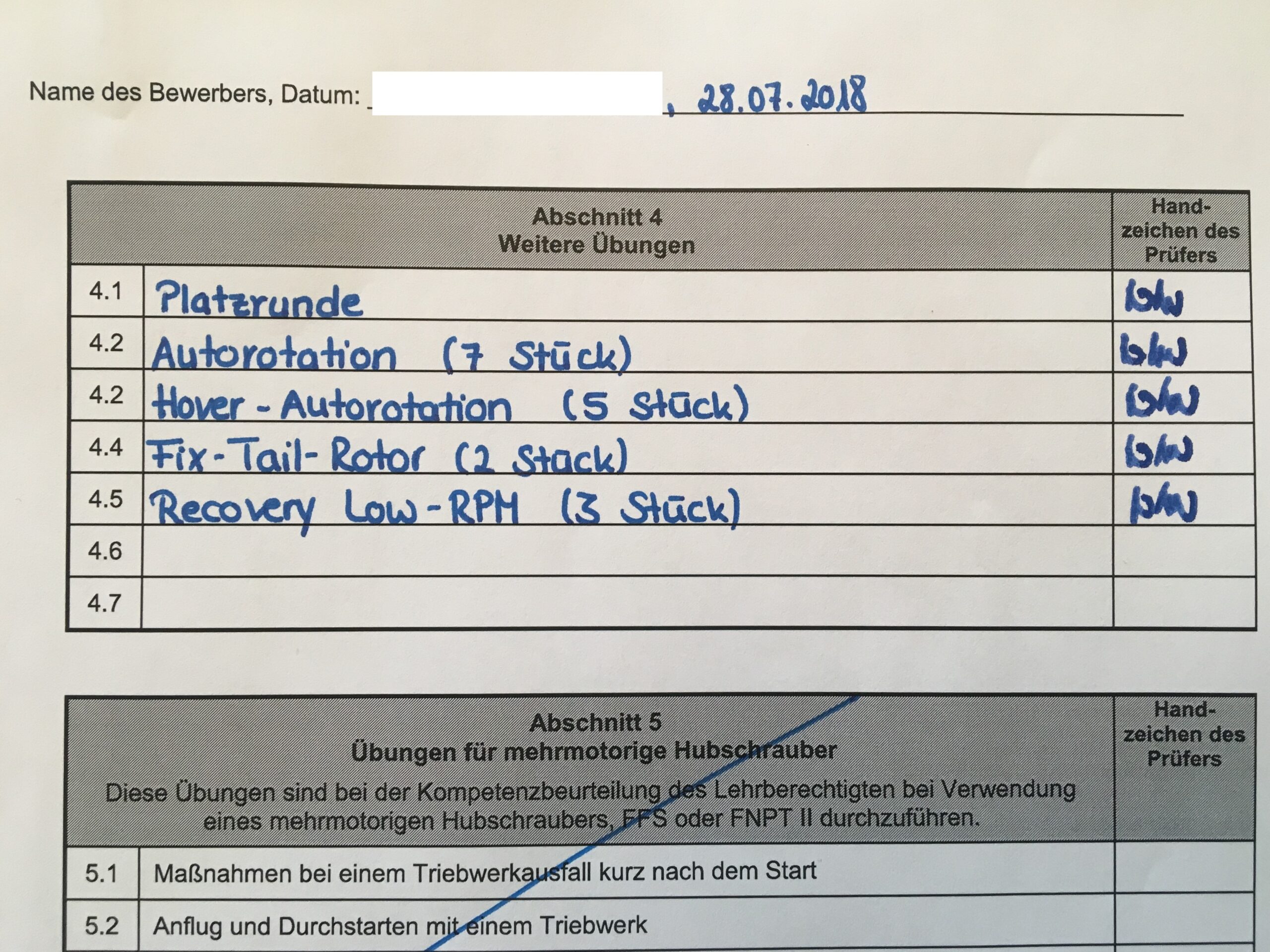Nun kommt der eigentliche Flug. Hierbei nimmt der zu Überprüfende den Sitzplatz des Fluglehrers ein. Zum Warmwerden startet Kai Naujokat den Flug mit den allgemeinen Normal- und Notverfahren. Im Anschluss startet der didaktische Teil: hier soll der Fluglehrer dem Flugschüler (Prüfer) die Verfahren gemäß dem vorab geführten Briefing beibringen. Hierbei stellt der Prüfer dem zu Überprüfenden speziell die Aufgabe Einfluss der Rotordrehzahl in Verbindung mit Fahrterhöhung und Fahrtreduzierung, sowie durch Veränderung des Einstellwinkels zu erklären. Dann erfolgte eine Sensibilisierung durch den Prüfer: Bei einer Autorotation simulierte er, was passiert, wenn vergisst das reduzierte Drehmoment richtig auszugleichen und bei falschen Eingaben des Flugschülers richtig zu reagieren.