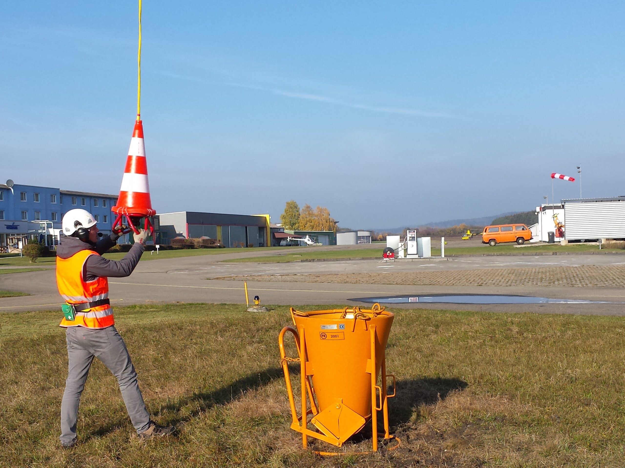 Zum Abschluss des Außenlasttrainings wurde das Betonieren simuliert. Nachdem der Bodenhelfer den Betonkübel angenommen hatte, sollte der Kübel entlang einer geraden Linie in konstanter Höhe über dem Boden bewegt werden.
