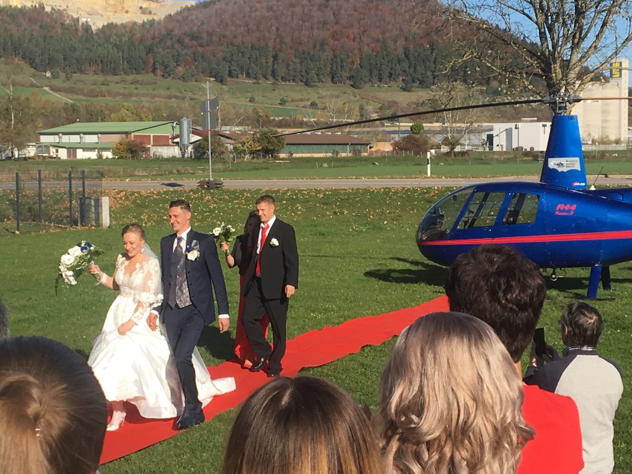 Heute fand ein weiterer Flug im Rahmen einer Hochzeit statt. Wir beförderten das Brautpaar vom Flugplatz Donaueschingen zur Eventlocation Geisingen. Empfangen wurden sie dort von Familie und Gästen mit einem roten Teppich zum Hubschrauber.