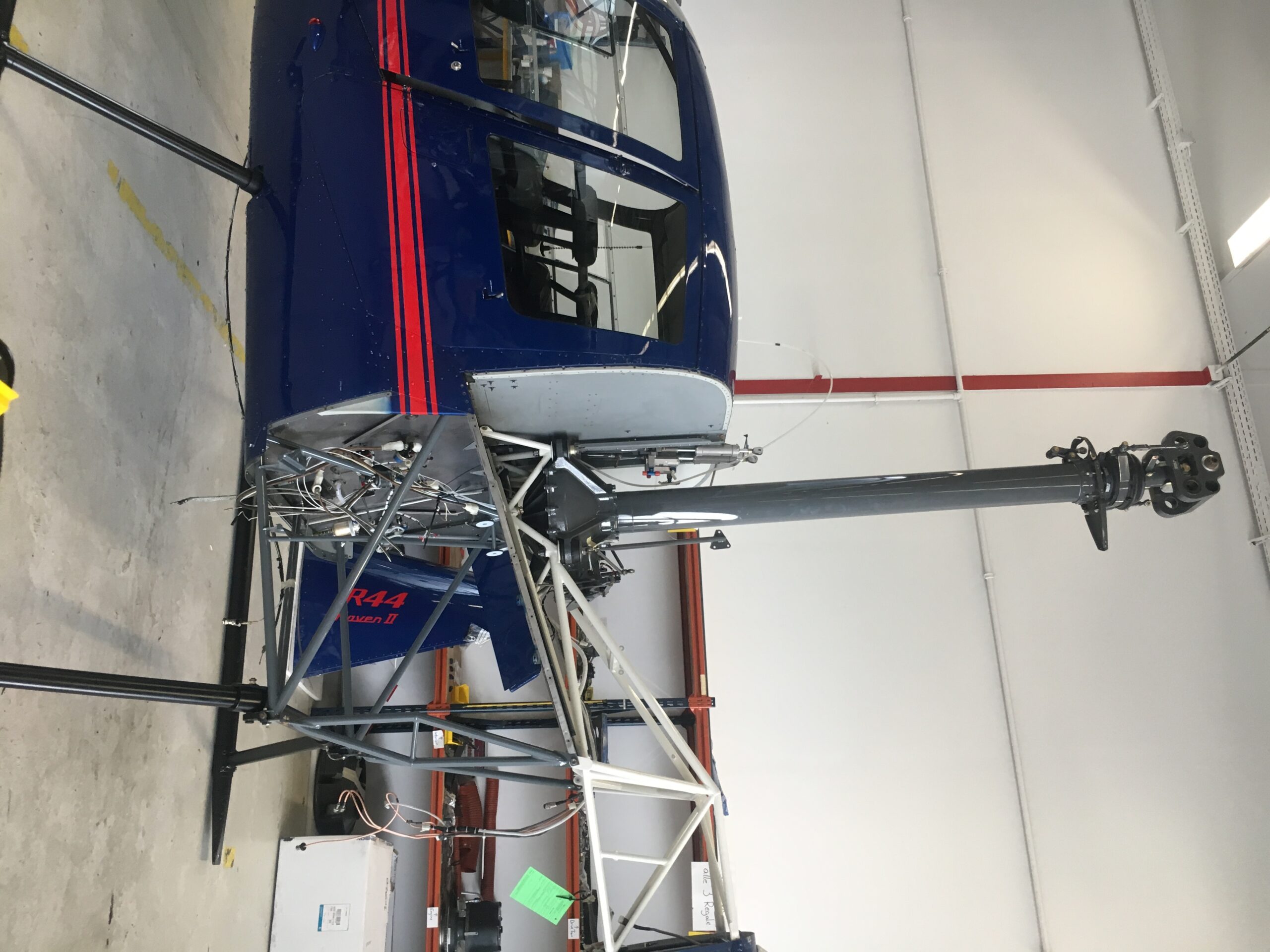 Anschließend werden die Skid Tubes montiert, also die eigentlichen Kufen. Sind diese montiert, kann der Heli wieder auf seinen eigenen Beinen stehen. Durch die fehlenden technischen Komponenten ist die Zelle sehr leicht. Somit kann diese von zwei Technikern angehoben werden und der Unterbau entfernt werden.