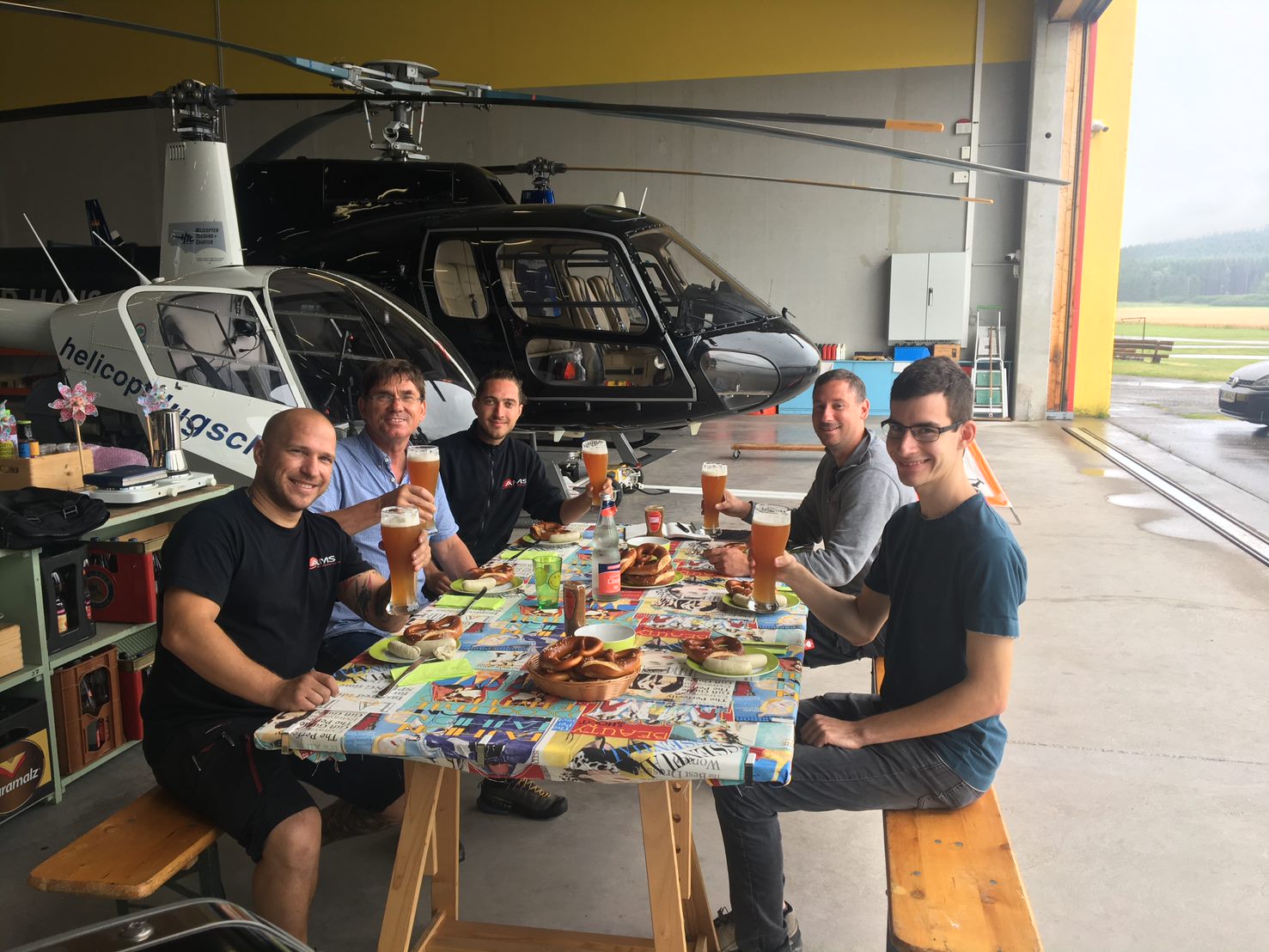 Nach einer morgendlichen Stärkung aus frisch gebrühtem Kaffee gingen alle ihrer Arbeit nach. Am Morgen bereiteten die Mechaniker die R22 D-HTCH für die anstehenden Arbeiten vor.